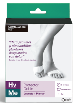 El protector doble Farmalastic, desarrollado por podólogos con EPITHELIUM 26® patentado de 1 mm de espesor sobre el juanete y 2,2 mm de espesor bajo la almohadilla natural del pie: